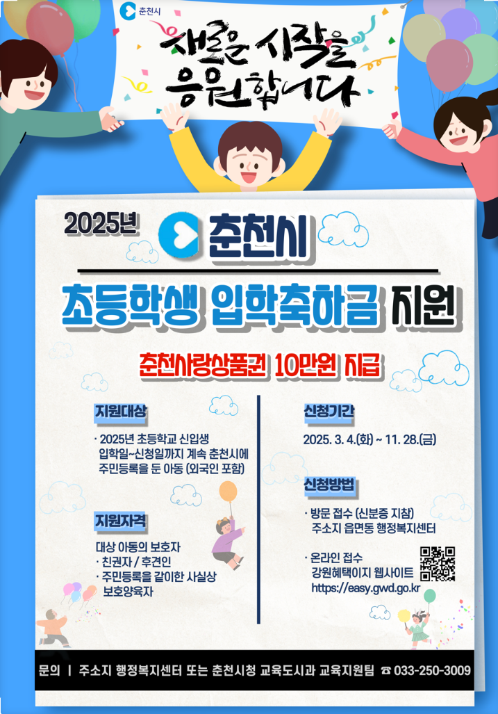 지원대상: 2025년 초등학교 1학년 신입생 (입학일~신청일까지 춘천시에 주민등록 유지)